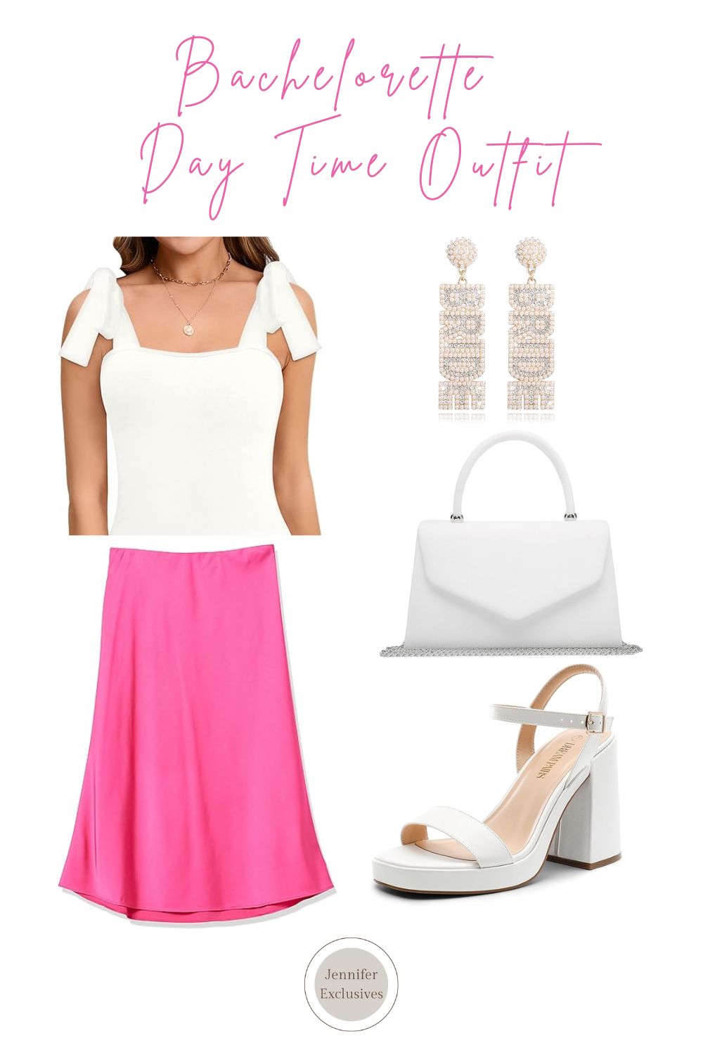 Shop The Look: White Top | Pink Satin Skirt | Bride Earrings | White Purse | White Heels Jennifer