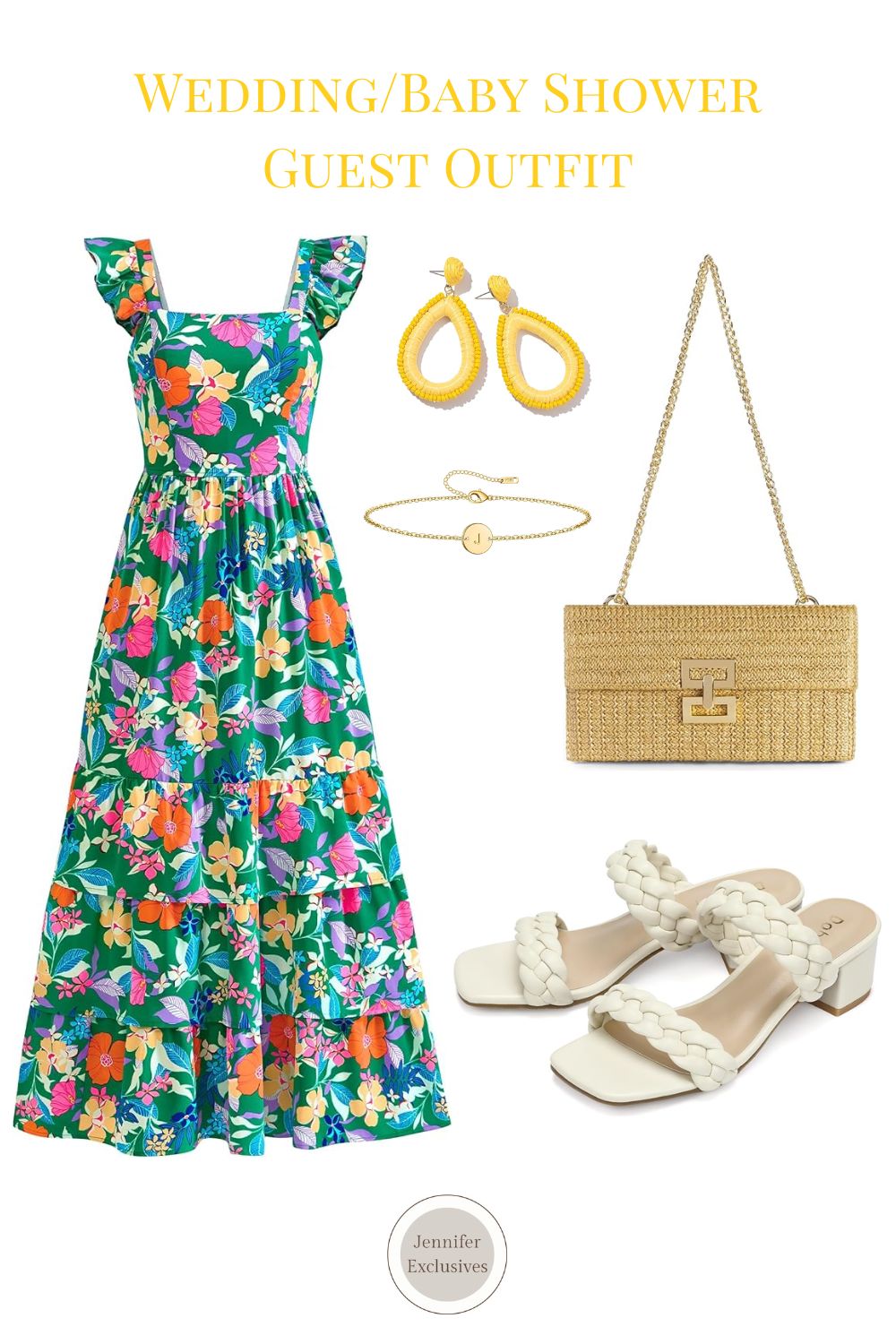 Shop The Look: Floral Maxi Dress | Braided Heels | Yellow Boho Earrings | Gold Initial Bracelet | Purse Jennifer